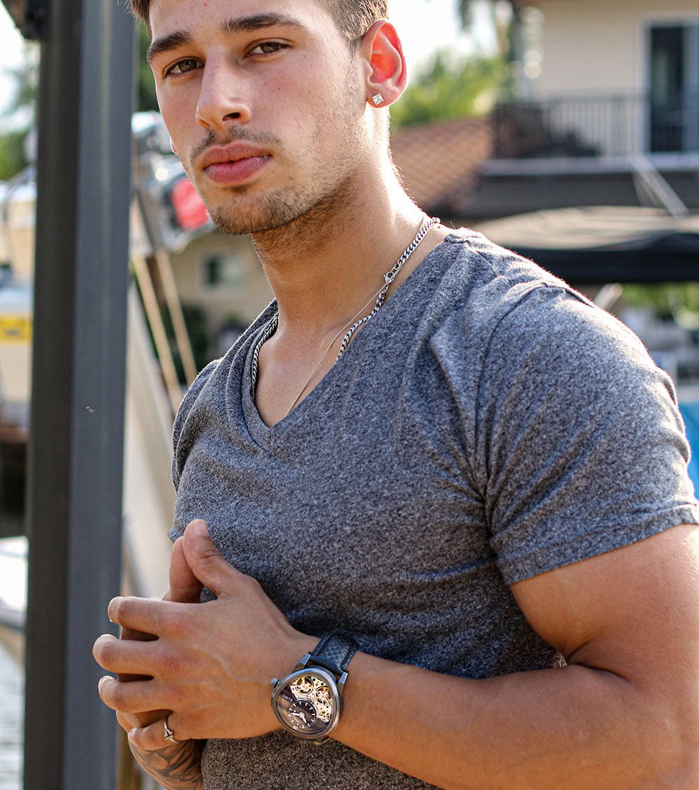 The Renegade: For the gentleman who stands out from the crowd and knows that his uniqueness is what defines him. The Quantus collection will catch the attention of onlookers while providing a level of comfort that is unprecedented with our unique curved case design. The dual balance wheels will mesmerize the gaze of anyone who catches a glimpse of this masterpiece..